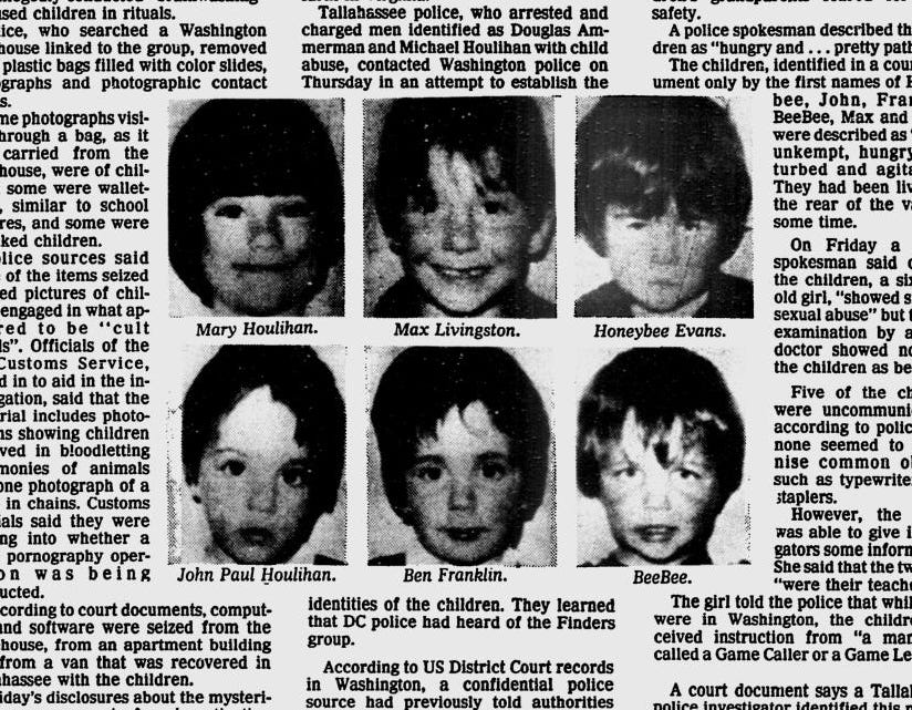 The group remained largely invisible until February 1987, when the Tallahassee police encountered two men associated with the Finders traveling with multiple children in a dirty and foul smelling van. Concerned citizens had contacted the police after witnessing the children in various states of neglect, who, when confronted by police, stated they were on their way to a school for “smart kids” in Mexico. The two men were evasive and uncooperative with police, and, for understandable reasons, both men were immediately arrested and placed on a $500,000 bond. This encounter initiated further coordination with the Metropolitan Police Department in Washington, D.C., where the Finders were headquartered. From there the case escalated in a manner that, at least initially, followed ordinary criminal procedure.